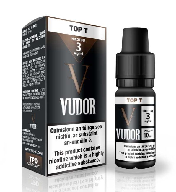 TOP T flavoured e liquid is mild flavoured tobacco, as close to the real think you will every get, made from the finest grade Nicotine in the world is now available in your area! The quality of vudor “Top T” e liquid need only speak for itself; its is premium quality all the way!